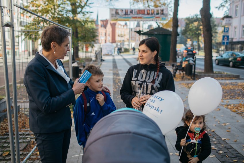 Od razu trafiamy w wir końcówki kampanii wyborczej prowadzonej przez obecną wiceprezydent na ulicach Słupska. Kandydatka bez żadnych obaw podchodzi do kolejnych napotkanych przechodniów, wręcza im gazetkę wyborczą, z której uśmiecha się do nas tandem Biedroń-Wojewódzka, papierową linijkę, na odwrocie której można znaleźć listę kandydatów na radnych z Komitetu Wyborczego Roberta Biedronia oraz list, w którym kandydatka kieruje kilka słów do mieszkańców miasta. Zawsze stara się zamienić kilka słów z zaczepionymi ludźmi.