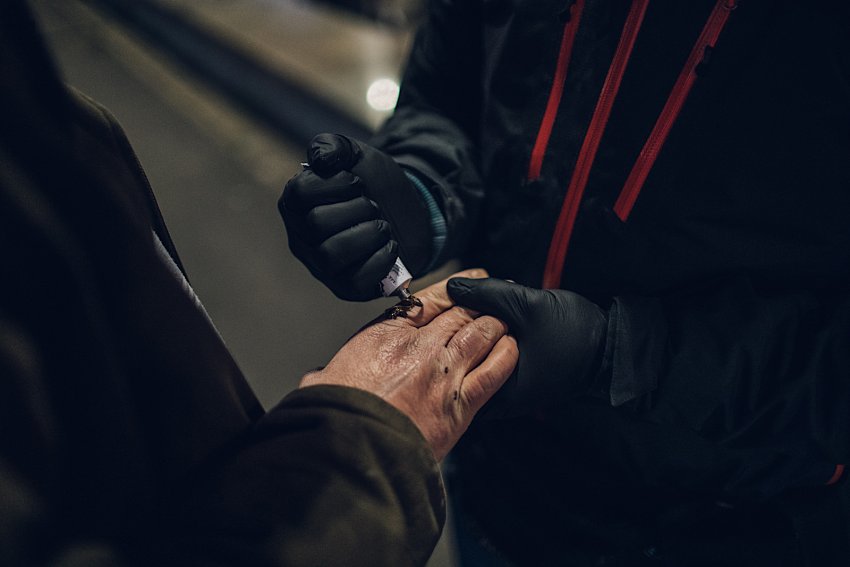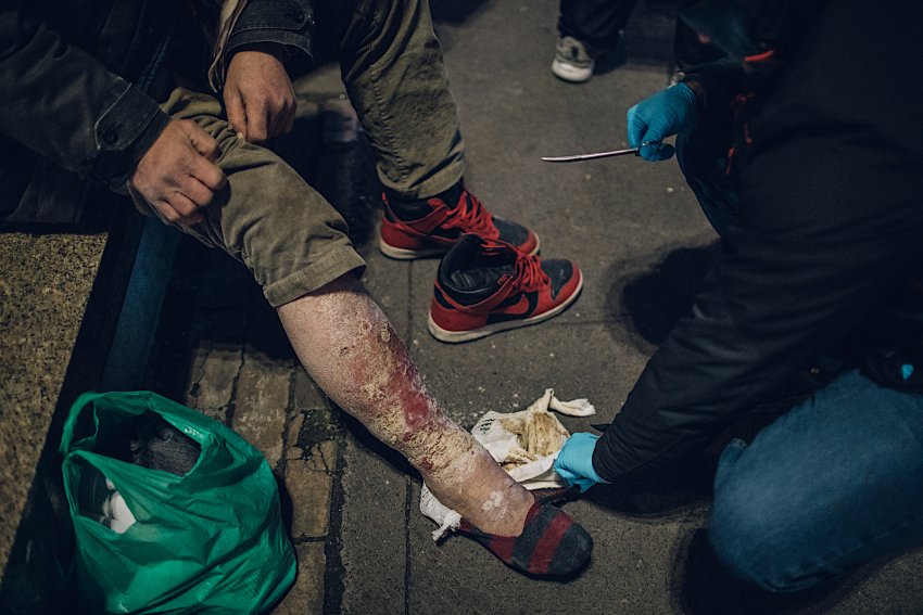 O dzisiejszej nocy na pewno nie można powiedzieć, że jest ciepła. Chłód wali po odsłoniętych dłoniach i kostkach, co chwilę ktoś z wolontariuszy zajmujących się wydawaniem jedzenia proponuje nam ciepłą kawę lub herbatę. W takich warunkach pracują Medycy na Ulicy – opatrując rozbite w bójkach nosy i łuki brwiowe, wymieniając bandaże na niegojących się ranach na łydkach bezdomnych.