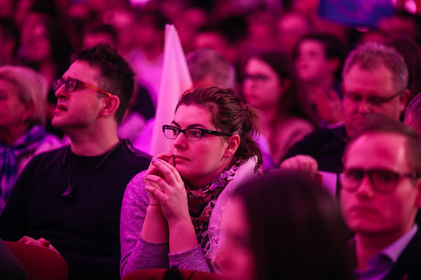 19-letnia Kaja w t-shircie Wiosny jest animatorką publiczności. Mówiąc krótko, ma własnym przykładem zadbać o to, by sala reagowała żywiołowo na to, co padnie ze sceny. Kaja uważa, że ugrupowanie Biedronia “jest jedyną sensowną partią w Polsce, dlatego trzeba się zaangażować”. Najważniejszy postulat? - Rozdział państwa od kościoła. U nas jest więcej kościołów, niż czegokolwiek innego - mówi. Wtóruje jej rówieśnica, Oliwia, która również pragnie, by Polska była świecka. - Jestem młoda i to będzie moje państwo w przyszłości - stwierdza.