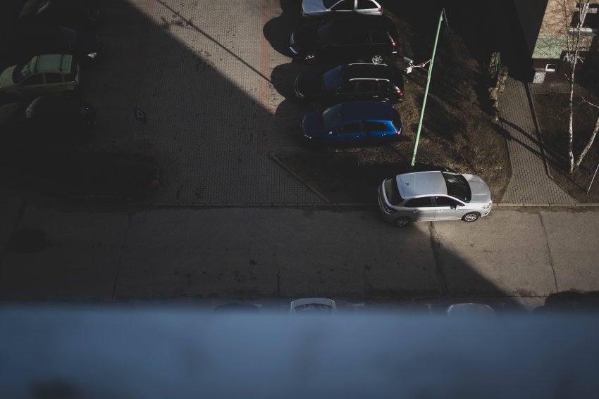 Gorzej jest, jeśli spojrzycie w dół. Tam już tak pięknie nie jest. Kostka chodnikowa, wielki parking, masa samochodów. Na miękkie lądowanie nie ma tutaj szans.