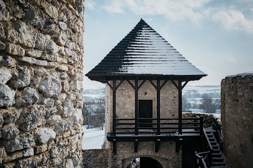 Drewniana furta jest ciężka, a do tego za nią leży gruba warstwa śniegu. Mimo to, senator specjalnie dla nas przepycha wrota, abyśmy zajrzeli w ten zakątek warowni w Bobolicach. Furta odsłania ukryty dziedziniec między murem obronnym a skałą, na szczycie której stoi kazimierzowski zamek. Warto było zajrzeć. Zadzieramy głowy w zachwycie.