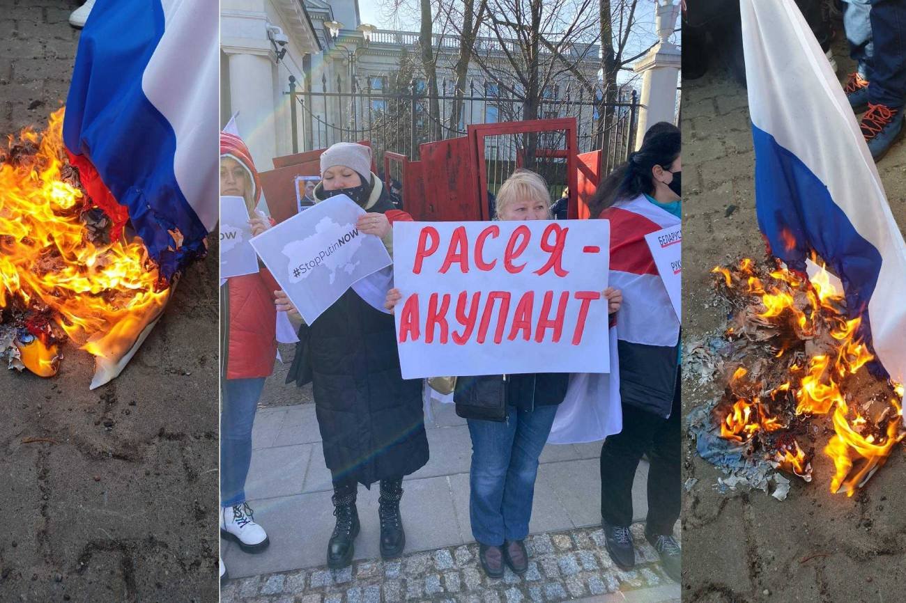 Pod rosyjską ambasadą w Warszawie odbył się protest solidarności wobec Ukrainy w obliczu wrogiej napaści i wprowadzenia kraju w stan wojny z Rosją. "Kijów Warszawa - wspólna sprawa", "Putin won" - wykrzykiwali manifestujący. Spłonęła też rosyjska flaga.