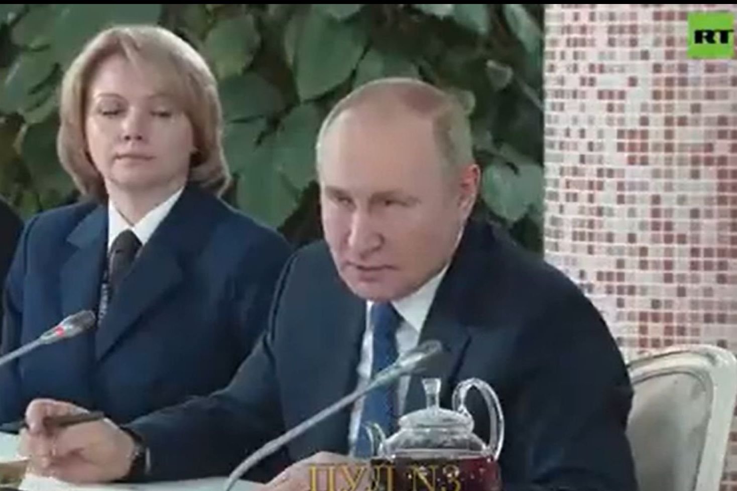 Prezydent Rosji siedział przy dużym stole. Widać było na nim herbatę czy posiłki. Obok Putina siedziało kilkanaście stewardess. Do tego Putin... żartował.