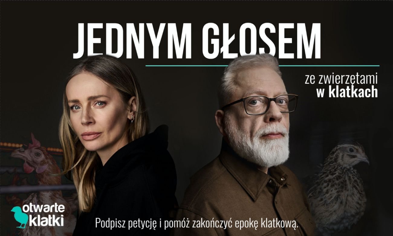 Otwarte Klatki w kampanii JEDNYM GŁOSEM wzywają do zaprzestania hodowli zwierząt w systemie klatkowym. Celem kampanii jest pozyskanie jak największej liczby podpisów pod petycją kierowaną do Ministra Rolnictwa. W promującym projekt spocie Anna Dereszowska, Tomasz Raczek, Agnieszka Woźniak-Starak, Lara Gessler, Zuza Kołodziejczyk, Bartosz Bielenia oraz Rafał Maślak przemawiają w imieniu 42 milionów zwierząt hodowlanych, które spędzają swoje życie w klatkach. Z poruszających historii królików, krów, przepiórek, kur niosek i świń, którym swojego głosu udzielają celebryci, wybrzmiewa apel o zakończenie epoki klatkowej.