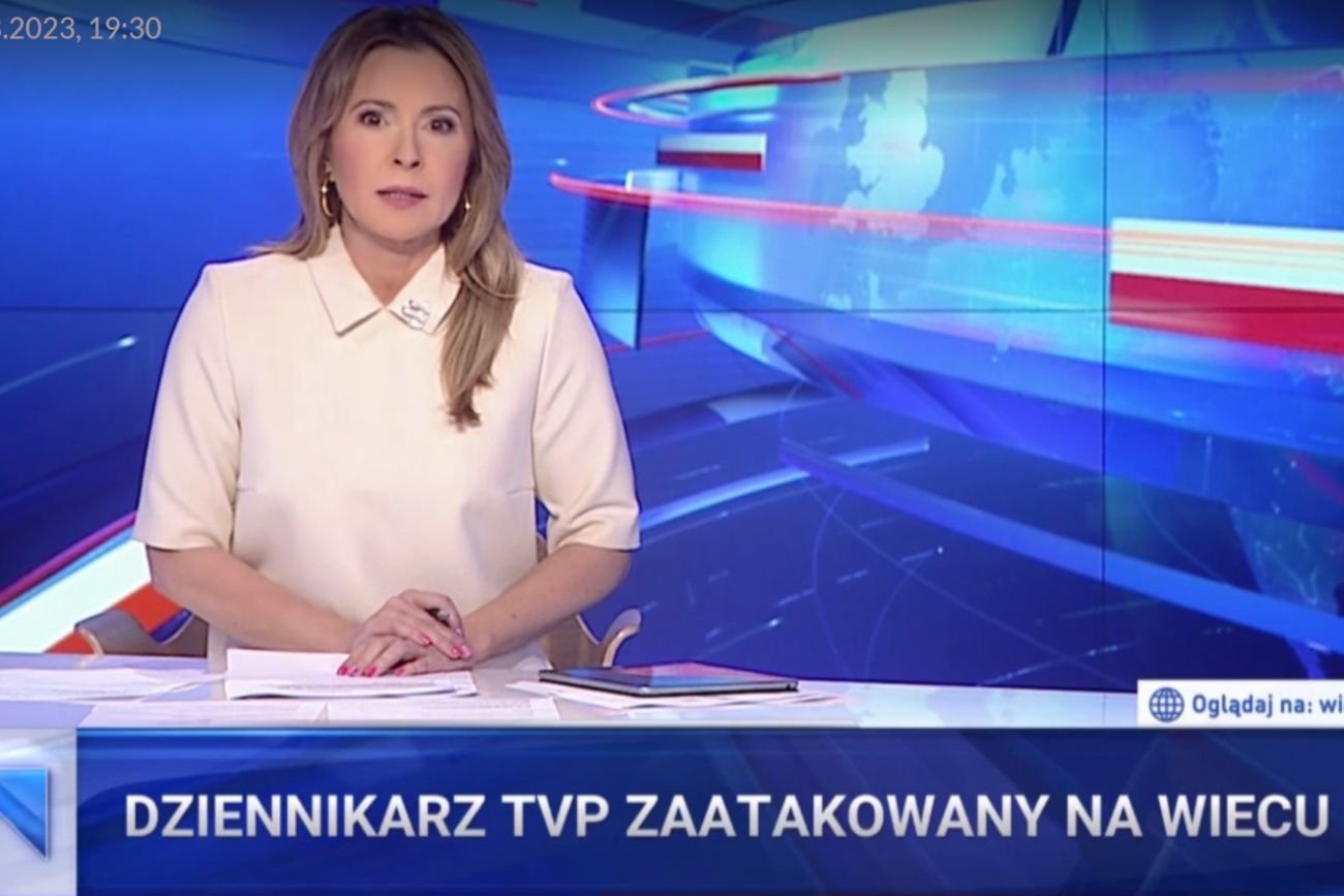 – "Wiadomości" zaczynamy od znamiennej sceny na wiecu Donalda Tuska w Legionowie. W dniu ogłoszenia przez prezydenta daty wyborów parlamentarnych doszło do nieparlamentarnej sytuacji. Nasz reporter został opluty. Adrian Borecki wraz z ekipą spotkał się także z agresją fizyczną. Zgłosił sprawę policji. Słów potępienia ze strony organizatorów: brak – tymi słowami zapowiedziała główny materiał prowadząca Marta Kielczyk.