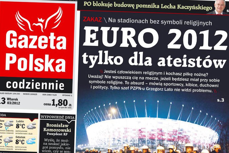 "Euro 2012 tylko dla ateistów" - krzyczy tytuł z okładki "GPC". To efekt dotarcia redakcji do regulaminu, który będzie obowiązywał na stadionach podczas zbliżających się mistrzostw Europy w piłce nożnej. Zgodnie ze standardami panującymi w zróżnicowanym pod każdym względem świecie sportu, dokument zakłada zakaz wnoszenia na stadion wszystkiego, co mogłoby doprowadzić do zbytniego podgrzania atmosfery. - Wśród symboli zakazujących wnoszenia m.in. broni, noży, butelek, strzykawek, petard i parasoli znajduje się przekreślona kartka i wyjaśnienie: „Materiały rasistowskie, ksenofobiczne, polityczne, religijne i propagandowe” - pisze zszokowany tabloid.