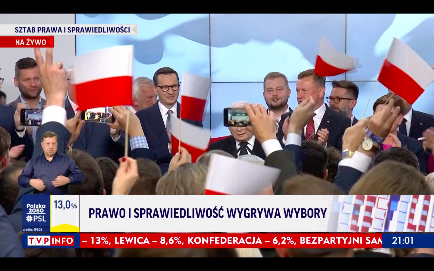 Według wyników exit poll, PiS – mimo największego poparcia – nie będzie w stanie zbudować sejmowej większości. Mimo tego w TVP Info królują hasła... "Prawo i Sprawiedliwość wygrywa wybory".