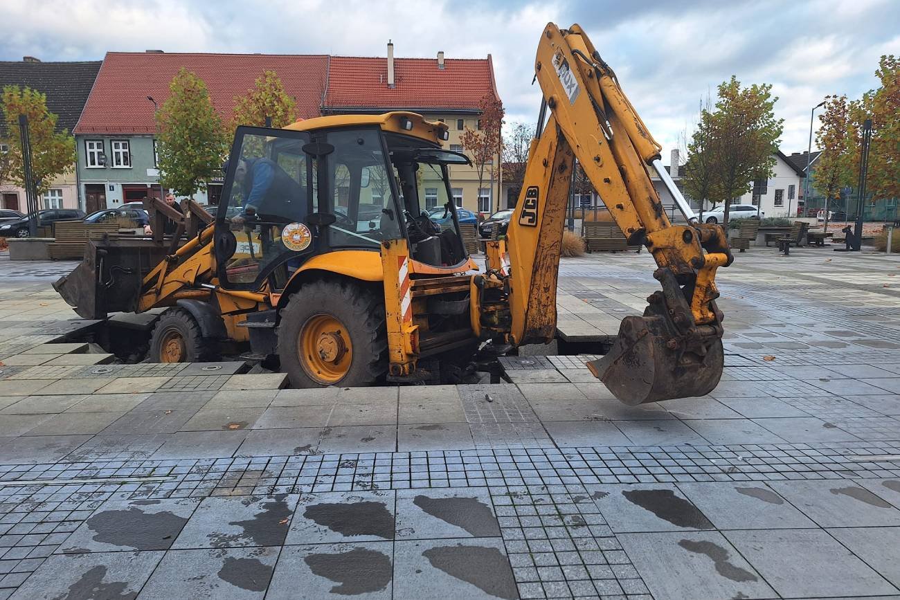 Usługę realizowała firma zewnętrzna, a operator koparki postanowił "ułatwić sobie zadanie". Przejechał przez środek placu, którego płyty zapadły się pod ciężarem maszyny.
