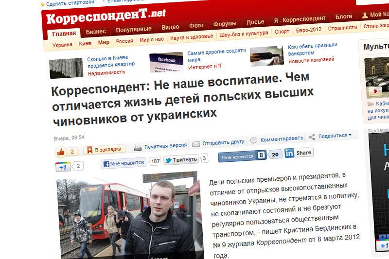 W przeciwieństwie do potomków ukraińskich liderów. Poziom życia dzieci znanych rodziców w Polsce i na Ukrainie według "Korespondenta" jest "radykalnie różny". Obaj synowie obecnego prezydenta Ukrainy Wiktora Janukowycza nie byli bowiem nigdy widziani, jak korzystali z publicznego transportu. Co miałby tam bowiem robić jeden z najzamożniejszych (notowany na liście 100 najbogatszych) Ukraińców, lub jego młodszy brat parlamentarzysta.