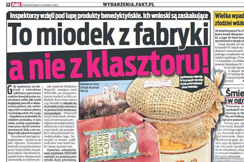 Niemałe zbulwersowanie wśród benedyktynów wywołała nasza publikacja, dotycząca podejrzeń, że oferowane z ich logo produkty nie różnią się od tych, które możemy kupić w zwykłych sklepach. "Fakt" twierdził, że jednostka gospodarcza Benedicite nie chciała o tym rozmawiać. My chcieliśmy, ale też się nie udało. Po długim odsyłaniu do kolejnych odpowiedzialnych osób, poproszono nas o wysłanie pytania e-mailem. Odpowiedź przyszła pod dwóch dniach, a w niej groźba pozwu.