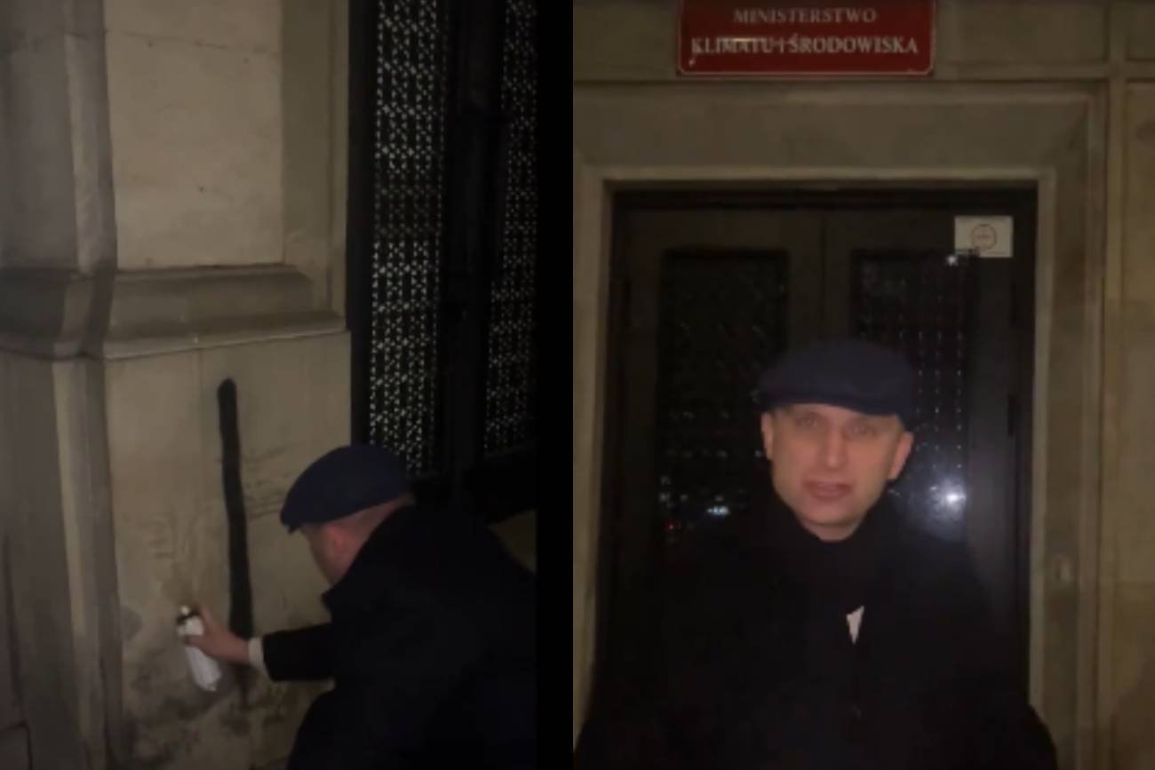 Działacz narodowców Robert Bąkiewicz postanowił "nauczyć polskości" przedstawicieli resortu klimatu i środowiska. Na elewacji siedziby ministerstwa wymalował znak Polski Walczącej.