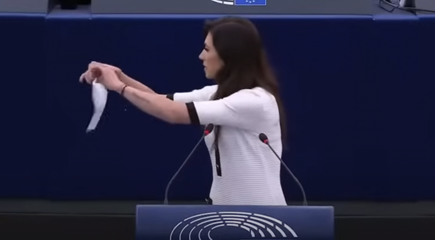 Po czym wyciągnęła przygotowane wcześniej kartki już z napisami po angielsku i patrząc w oczy przewodniczącej KE teatralnie je podarła. Von der Leyen wyglądała na zdziwioną i rozbawioną, z kolei przewodnicząca PE Roberta Metsola na bardziej zażenowaną. Końcówka wystąpienia Polki odbyła się w akompaniamencie słów Metsoli o to, by zakończyła już swoje wystąpienie ("czas się skończył, czas się skończył"), ponieważ jej czas na mównicy dobiegł już końca.