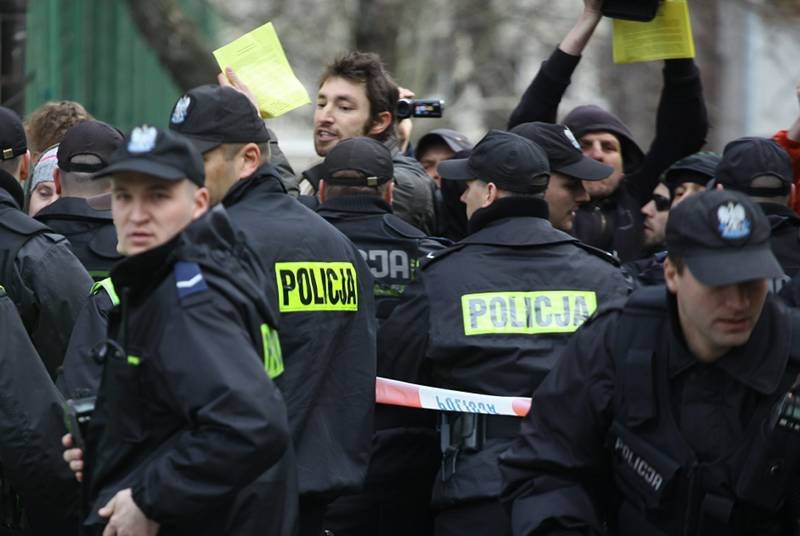 Pod budynkiem nie jest jednak tak spokojnie, jak zapewniał rzecznik. Między policją i osobami okupującymi budynek wywiązują się przepychanki.