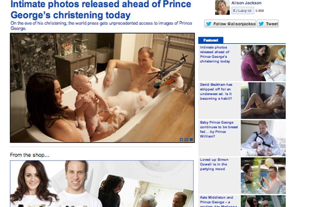 Seria zdjęć przedstawia księcia Williama i księżną Kate podczas kąpieli ze swoim dzieckiem. Możemy też oglądać parę podczas przewijania bobasa, a także samego księcia Williama, który karmi dziecko sztuczną piersią. Na fotografiach pojawia się także królowa, która robi parze i jej dziecku zdjęcie telefonem komórkowym.