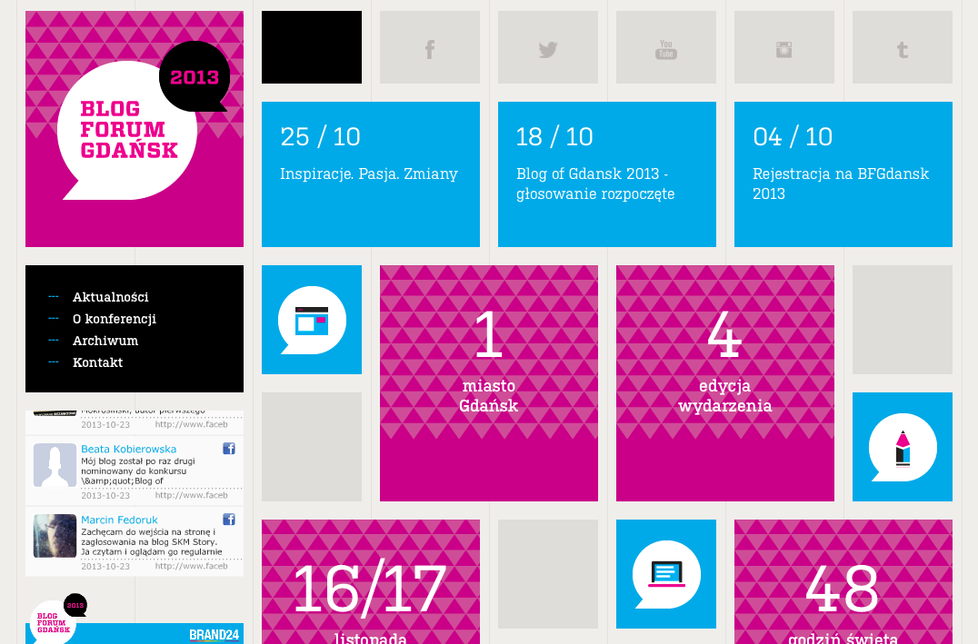 W programie BFGdańsk 2013 znajdą się prelekcje i wykłady, a także sesje pytań i odpowiedzi z przedstawicielami wybranych blogosfer. Dla uczestników przygotowano wiele dodatkowych atrakcji związanych z blogosferą i Gdańskiem. Konferencja od pierwszej edycji cieszy się dużym zainteresowaniem nie tylko samych blogerów, ale również ich czytelników, dziennikarzy i specjalistów w dziedzinie nowych mediów. Dla tych odbiorców organizatorzy przygotują, jak co roku, transmisję online z całego wydarzenia, dostępną również na stronie naTemat.pl