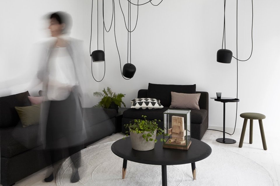 Wnętrze, które we współpracy z nimi zaprojektowała wspaniała Eva Lilja Löwenhielm, projektantka wnętrz i mebli, rozniosło się po blogosferze w kilka dni. Typowo skandynawskie, jasne i przestronne wnętrze zostało urządzone w trzech kolorach. Dominuje biel, zestawiona z ciemną, elegancką grafitową szarością i kobiecym, ale bardzo subtelnym pudrowym różem.