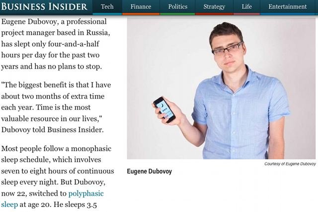 Eugeniusz Dubowoj od dwóch lat śpi po 4,5 godziny na dobę i zapewnia, że czuje się znakomicie. – Największą zaletą takiego rozwiązania jest to, że każdego roku zyskuję około dwóch miesięcy dodatkowego czasu – podkreślił 22-letni Rosjanin, który należy do zwolenników koncepcji snu polifazowego.