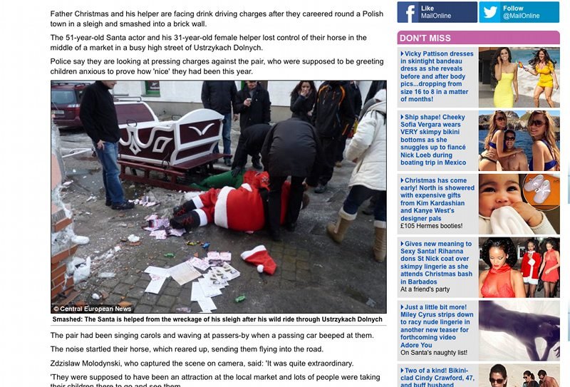 Brytyjski dziennik "Daily Mail" dostrzegł wreszcie Polaków. Niestety, na uwagę Brytyjczyków zasłużył 51- letni Mikołaj z Ustrzyk Dolnych, który równie pijany jak pomagająca mu Śnieżynka, zderzył się ze ścianą w czasie przejażdżki saniami.