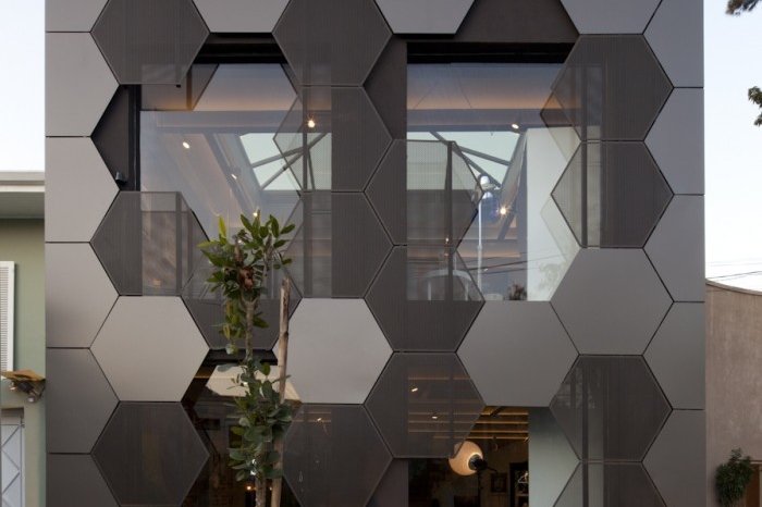 Metalowe panele, z których zrobiono elewację, inspirowane są oczywiście plastrem miodu. Niecodzienna forma pozwoliła architektom zastosować przezroczystości i półprzezroczystości, dzięki czemu, tam, gdzie potrzebne było więcej prywatności, okna mogły być bardziej zasłonięte. Budynek pokryty jest panelami matowymi. Wnętrze sklepu zostało dopasowane do potrzeb, min. poprzez zaprojektowanie systemu, dzięki któremu zmiana ustawień światła i ekspozycji jest dziecinnie prosta.