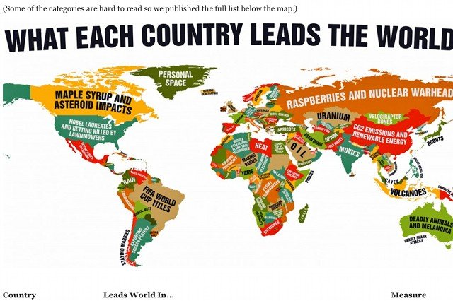 Argentyna – eksport piłkarzy; Australia – śmiertelnie groźne zwierzęta i czerniak złośliwy; Białoruś – żubry; Republika Środkowoafrykańska - drogi internet; Francja – turystyka; Niemcy – prawie wygrane mistrzostwa świata; Gruzja – chaczapuri; Iran – drenaż mózgów; Mongolia – kości welociraptora; Słowenia – kasyna; Szwecja – ateizm; Hiszpania – dawcy narządów; Słowacja – produkcja samochodów.