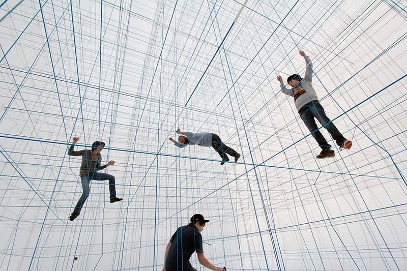 Prototyp ich najnowszego dzieła znajduje się teraz w Wiedniu. Biała, nadmuchiwana kostka mieści w sobie instalacje ze sznureczków, które wyglądają trochę jak siatka z programów do projektowania modeli 3D. Ponieważ ściany i podłoga we wnętrzu instalacji są białe i nie ma pomiędzy nimi wyraźnych kątów, łatwo stracić tutaj orientację i poczuć się tak, jakby nie było ograniczonej przestrzeni, tylko siatka.