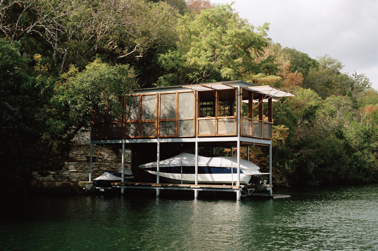 Ten dom został wzniesiony na stromym brzegu Jeziora Austin, jako posiadłość rekreacyjna, z której właściciele korzystają podczas dłuższych weekendów i urlopów. Z jeden strony jest otoczony gęstym lasem, z drugiej jeziorem. Żeby do niego trzeba przez ponad kilometr maszerować leśną trasą, a potem przejść już bezpośrednio do działki podwieszanym mostem. Raczej nie ma tutaj możliwości skorzystania z ciężkiej, budowlanej maszynerii.