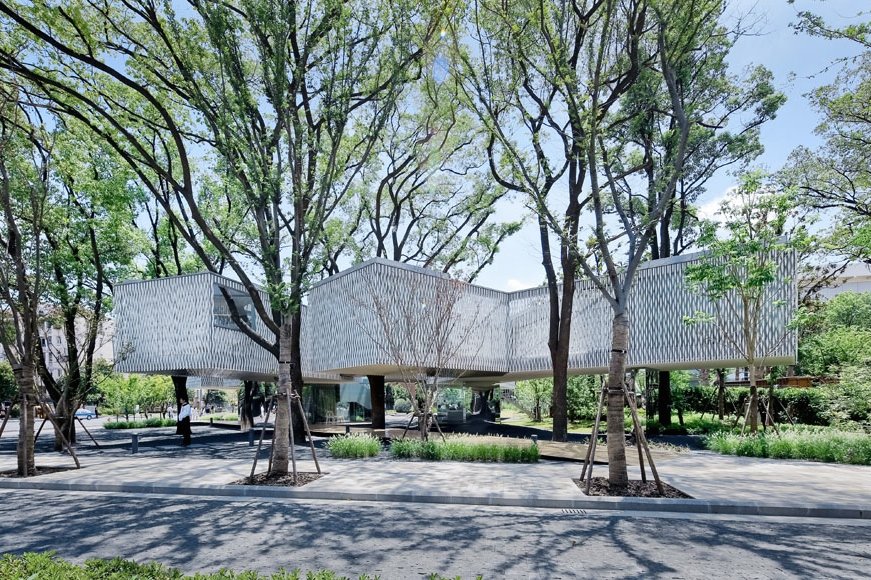 Na parterze wybudowano tylko ściany niezbędne do podtrzymania konstrukcji i funkcjonowania budynku. Najważniejsza część budynku została uniesiona, stwarzając pod spodem, zacienioną, wolną przestrzeń do wypoczynku. Budynek zdaje się być lekki, także dzięki wykorzystanym materiałom. Szkło i ażurowe panele z białej, nierdzewnej stali tworzy efekt przypominający z daleka unoszącą się pomiędzy drzewami mgiełkę.