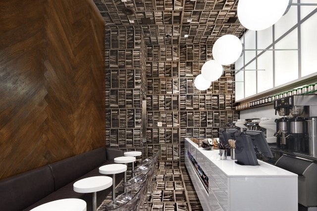 Na kawę warto zajrzeć do kawiarni D'espresso Cafe. Nie ze względu na dobrą kawę, o którą w mieście nietrudno, tylko z uwagi na intrygujące wnętrze. Studio Nema Workshop zaprojektowało tę przestrzeń w sposób dosłownie – przewrotny. Drewniana podłoga w jodełkę została ułożona na ścianie, a półki z książkami... na podłodze. Kawiarnia mieści się przy Madison Avenue. Efekt jest przedziwny, odważny i hipnotyzujący. Tym wnętrzem zresztą D'espresso zrobiło sobie ogólnoświatowy PR. Pierwsze artykuły o nich czytałam już w 2010 roku. I chyba wciąż idzie im bardzo dobrze, bo opinie klientów są w przeważającej większości pozytywne.