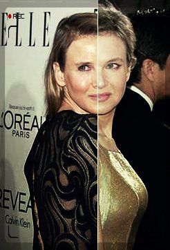 Ale przecież nawet ja, która uważam, że porównywanie zdjęć teraźniejszych ze zdjęciami z czasów tzw. króla Cwieczka jest trochę nie fair, szczególnie w stosunku do kobiety, muszę przyznać, że zmiana jest ogromna, nawet w stosunku do zdjęć Zellweger z zeszłego roku. Jej oczy, tak zmysłowe, kocie i tak bardzo dla niej typowe, wyróżniające ją z całego grona innych mniej lub bardziej zdolnych i ładnych aktorek, otrzymały inną, nowa oprawę, uśmiercając na zawsze swą specyficzność.