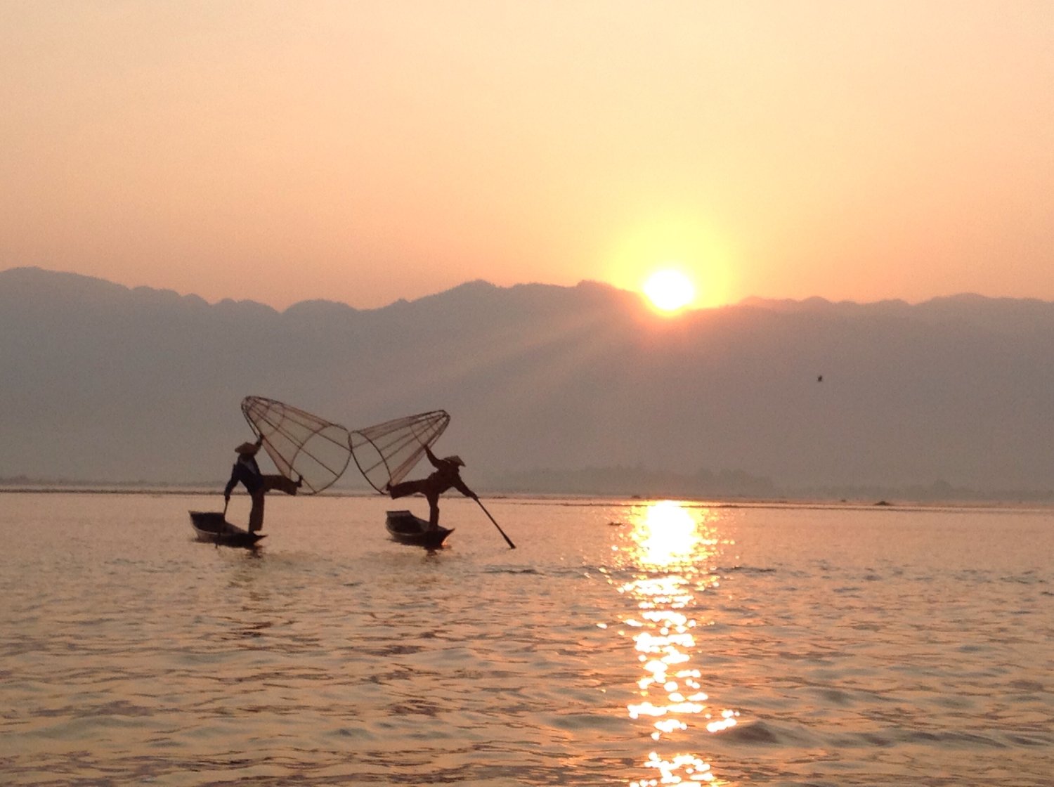 Zaczęło powoli wschodzić słońce. Byliśmy juz na środku jeziora, mgły opadły, a nam ukazała się piękna tafla jeziora. Było coraz więcej rybaków. Ruch na jeziorze wzmagał się. Obserwowaliśmy jak wyciągają sieci pełne ryb, jak przepływają wiosłując w swój nietypowy sposób. Wyglądało to niezwykle, wręcz jak spektakl, a nie zwyczajny poranek nad jeziorem Inle.