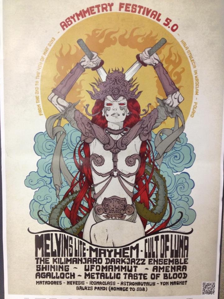 Moja przygoda z wrocławskim Asymmetry Festival zaczęła się w 2010 roku w trakcie drugiej edycji w Firleju, gdzie miałem sposobność widzieć takie zespoły jak połamany death/funeral doomowy Esoteric czy sludge doomowy Mouth of the Architect. Wcześniej miałem okazję uczestniczyć w Firleju w koncertach takich grup jak Isis, Boris czy Cult of Luna (szwedzki oktet wystąpił dzisiaj w ramach drugiego dnia Asymmetry Festival obok m.in The Kilimanjaro Darkjazz Ensemble czy norweskiego Shining). Piąta edycja Asymmetry Festival została przeniesiona do Wrocławskiego Centrum Kongresowego. W tym roku poszerzyła się nieco formuła festiwalowa (obok brzmień doomowych, stonerowych, sludgowych czy awangardy jazzowej/electro pojawiły się zespoły death czy black metalowe). W związku z tym, że nie dostałem akredytacji dziennikarskiej na całą imprezę relację ograniczę tylko do pierwszego dnia festiwalu, w którym wystąpiły m.in amerykański post-rockowo/folk/doom black metalowy Agalloch, polska machina death metalowa Vader oraz legenda norweskiego black metalu Mayhem. Siłą rzeczy skupię się na wykonawcach ze sceny głównej.