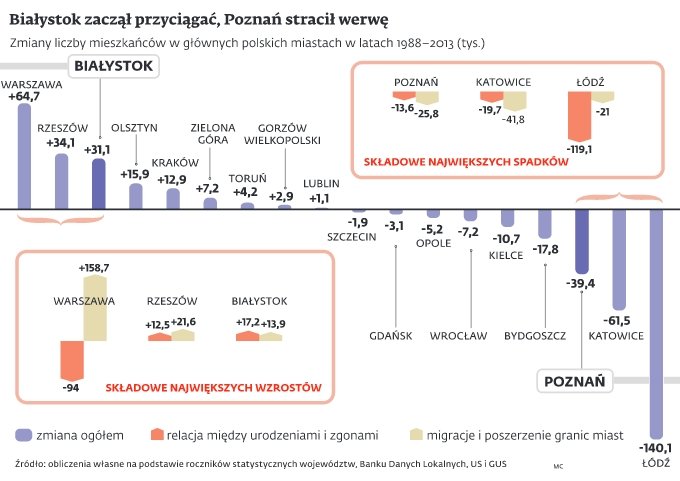 Gdyby nie słoiki, czyli ludność napływowa – kurczyłaby się również Warszawa. Co ciekawe, trend ucieczki z miasta nie dotyczy Polski B. Jednym z miast, które najbardziej urosły, jeśli chodzi o mieszkańców, jest Białystok. Kurczy się za to Łódź. I miasta, w których się dobrze zarabia i nie ma bezrobocia: Katowice i Poznań. Podobnie jest w Bydgoszczy, Gdańsku, Kielcach, Opolu, Szczecinie i Wrocławiu – wynika z danych regionalnych urzędów statystycznych i GUS. - pisze Dziennik Gazeta Prawna