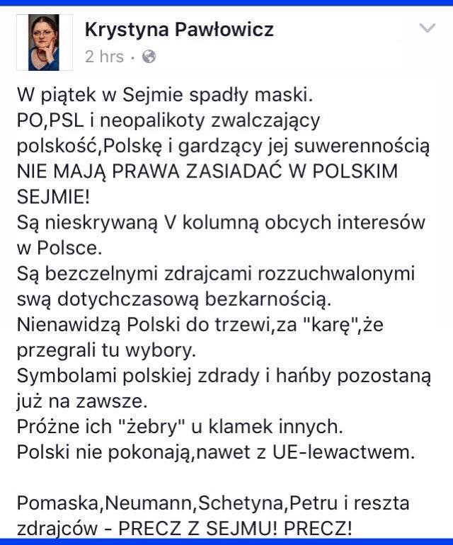 Poseł Krystyna Pawłowicz niezmiennie w świetnej formie. Takiego jadu w kilku krótkich zdaniach nie wylała z siebie chyba nigdy do tej pory. Pani Krystynie zastępuje mównicę sejmową Facebook. Kiedyś myślałem, że polityk to aktor w blasku kamer i fleszy. I tak w wielu przypadkach jest. Ale jeśli chodzi o posłów PiS, to oni nie grają, oni nie udają. Oni po prostu nienawidzą.