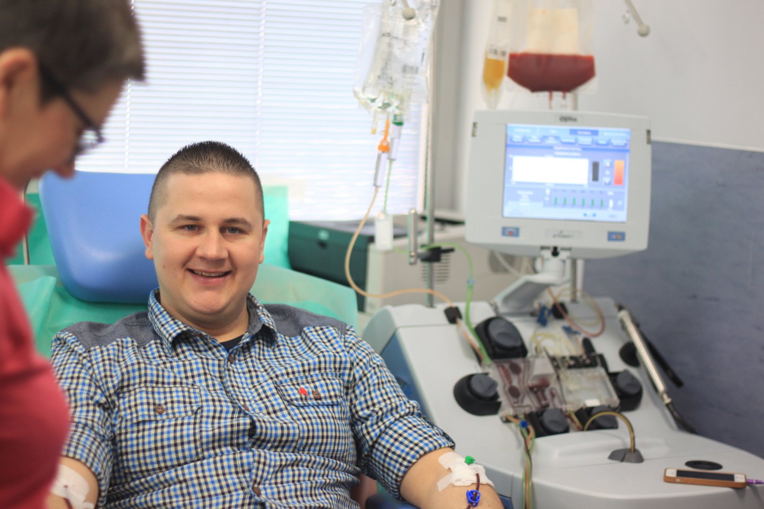 - Kiedy dowiedziałem się, że mogę zostać dawcą, byłem bardziej zaskoczony niż zestresowany, tym bardziej, że właśnie się dowiedziałem, że jestem 1000. dawcą - mówi 29-letni Adam Leśniak. Nasz 1000. dawca zarejestrował się w bazie na stronie www.dkms.pl w styczniu 2013 roku. O tym, że może pomóc uratować komuś życie, dowiedział się pod koniec sierpnia ubiegłego roku. Po zakończeniu procedur medycznych, które potwierdziły jego zgodność z biorcą, pojawił się wczoraj o świcie w Banku Komórek Krwiotwórczych w szpitalu na Banacha. Towarzyszyła mu jego narzeczona Ania, z którą bierze ślub już pod koniec marca. Wielkie emocje dodatkowo spotęgowały wizyty mediów, które postanowiły uwiecznić tę radosną chwilę. Adam dzielnie udzielał wywiadów, a w tym samym czasie z jego krwi odseparowywane były komórki macierzyste, które trafią do kogoś, kto właśnie walczy z rakiem krwi.