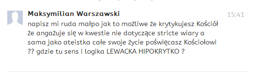 Teraz ja wam pokażę uciemiężenie, oraz to jakim językiem pisze do mnie nasza prawica. Otrzymuję groźby, że ktoś mnie „załatwi, jestem obrzucana wyzwiskami. Rozumiem że to wszystko dzieje się dlatego że jesteście tacy wyrozumiali w swej miłości do bliźniego? To dlatego niektórzy chcą mnie zabić? Polski katolik, to dla mnie w większości przypadków człowiek który nie jest godny tego aby określać sam siebie chrześcijaninem. Ponieważ nienawidzi wszystkiego co inne, co nie mieści się w konserwatywnej wizji świata. Szczególnie ateistycznej mniejszości. Przekonuję się o tym codziennie na własnej skórze.