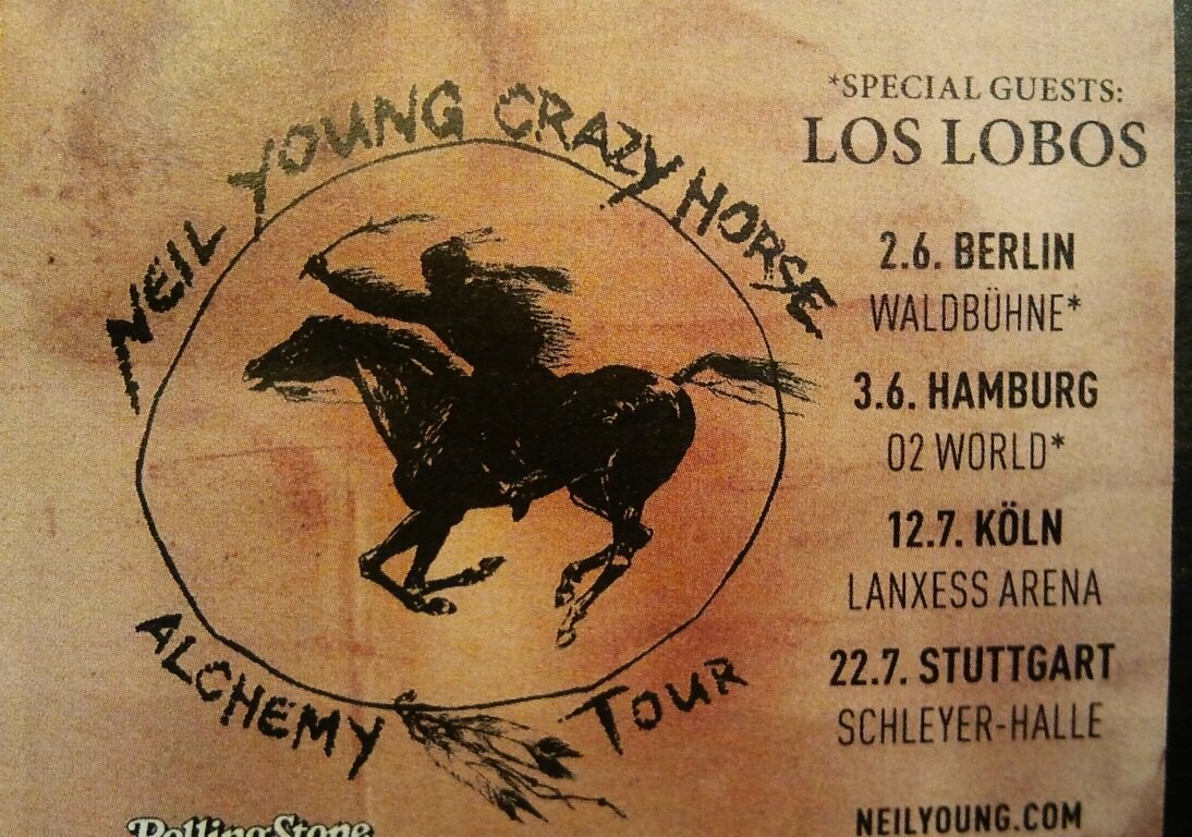 Europejska część „Alchemy Tour” rozpoczęła się w berlińskim Waldbühne, wielkim betonowym amfiteatrze będącym częścią kompleksu olimpijskiego pamiętającego jeszcze czasy hitlerowskie. Tego wilgotnego czerwcowego wieczoru szczelnie wypełniło go ponad dwadzieścia tysięcy sympatyków Kanadyjczyka, często podążających za nim na drugi koniec świata. Do środka wpadliśmy dosłownie w ostatniej chwili, zdążyliśmy tylko kupić piwo, zająć strategiczną pozycję i po chwili z głośników popłynęły pierwsze dźwięki TEJ gitary. Young i jego długoletni towarzysze z Crazy Horse prezentują podczas tej trasy swoje zdecydowanie hałaśliwe i zgiełkliwe oblicze. Zaczęli od „Love and Only Love” z „Ragged Glory”. Ascetyczna scena, z wyjątkiem dużego logo pozbawiona dekoracji pozwalała skupić się na muzyce i muzykach. Crazy Horse ubrani byli na biało, mistrz ceremonii na czarno, skrywając twarz pod rondem kapelusza. Za moment (tzn. jakieś dziesięć minut gitarowego warkotu) grali już genialne „Powderfinger”, przywitane owacyjnie przez międzynarodową publiczność. To w końcu jeden z najbardziej znanych kawałków artysty. Krótkie przywitanie i jedziemy z nowym materiałem. Numer tytułowy z ostatniej płyty i znakomicie wykonany, skrzący się od kapitalnych solówek „Walk Like a Giant” czyli singiel trwający w wersji płytowej szesnaście i pół minuty, w Berlinie rozciągnął się do ponad dwudziestu.