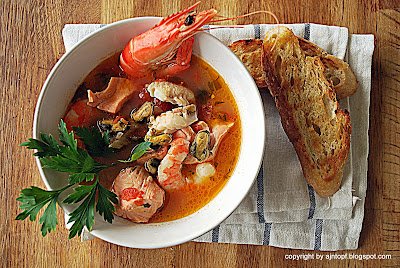 Na patelni rozgrzejcie masło, wrzućcie pokrojoną szalotkę, chwilę podsmażcie i dodajcie czosnek. Następnie wrzućcie pokrojone pomidory pozbawione gniazd nasiennych, dolejcie wino i sos rybny. Chwilę podgotujcie i dodajcie wywar warzywny i tymianek, wymieszajcie wszystko , przykryjcie i gotujcie przez 2min. Dodajcie rybę pokrojoną w spore kęsy, poczekajcie aż zmięknie, ok. 3min, wtedy wrzućcie małże i obrane krewetki. Dodajcie posiekaną natkę. Podawajcie z grzankami. Smacznego!