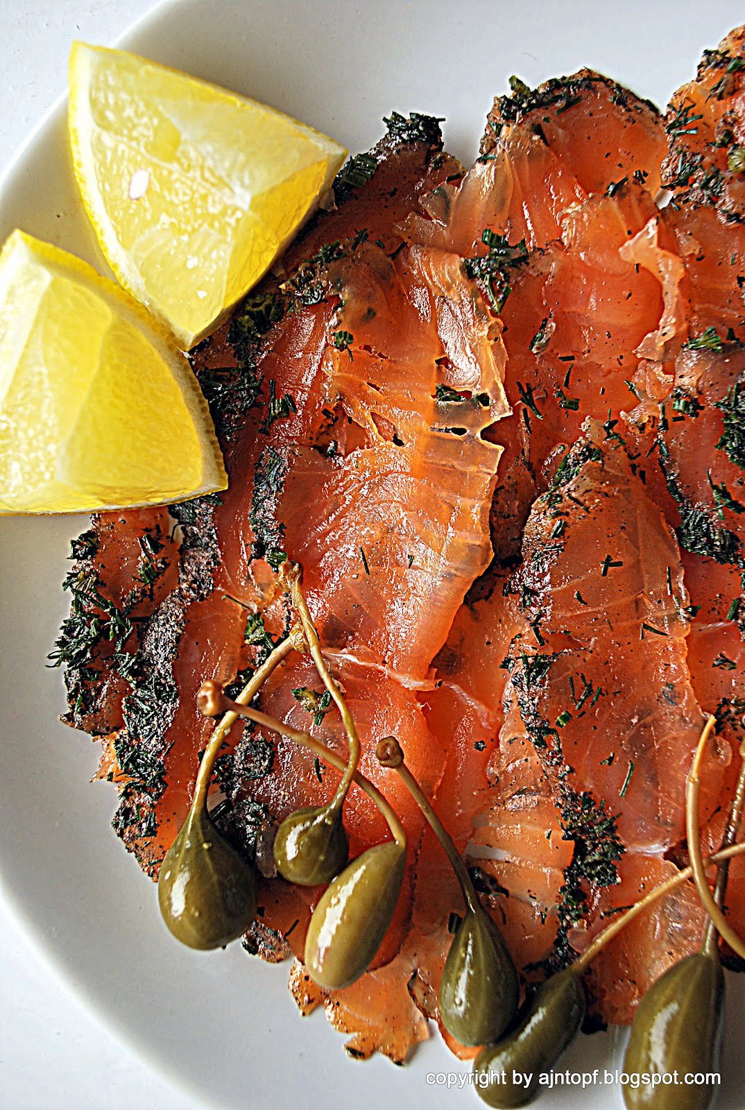 Koperek posiekajcie bardzo drobno, wymieszajcie z przyprawami i zalejcie koniakiem. Łososia podzielcie na porcje, tak żeby można było zrobić z niego "kanapki". Każdą część posmarujcie przyprawami i złóżcie kanapki skórą na zewnątrz. Tak przygotowanego łososia szczelnie owińcie folią aluminiową i włóżcie do lodówki na 48 godzin. Po tym czasie część możecie zamrozić, ciężko będzie zjeść od razu 2,5kg. Łososia podajemy na dwa sposoby, pokrojonego w cienkie plasterki, ze świeżą bagietką albo jako składnik sushi maki. Smacznego! Po więcej przepisów zapraszamy na www.ajntopf.blogspot.com