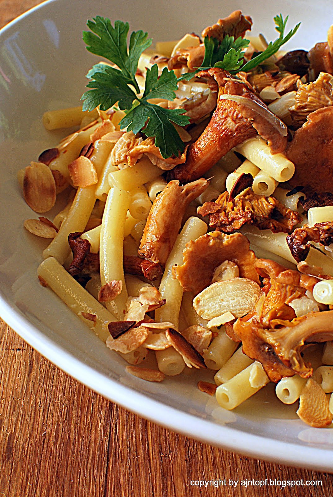 Kurki umyjcie delikatnie, acz dokładnie. Osuszcie papierowym ręcznikiem. Większe przetnijcie na pół. Ugotujcie makaron w dobrze osolonej wodzie. W międzyczasie uprażcie migdały na suchej patelni. Róbcie to ostrożnie, żeby ich nie przypalić. Jak tylko zrobią się brązowe, przesypcie z patelni do innego naczynia.Na głębokiej patelni rozgrzejcie masło. Dodajcie szalotki i czosnek. Jak szalotki się zeszklą dodajcie kurki. Po ok. 5 minutach wlejcie wino, poczekajcie jak odparuje i dodajcie śmietanę. Dodajcie do smaku sól i pieprz. Chwilę podgrzejcie, dodajcie ugotowany makaron. Dobrze wymieszajcie. Przed podaniem posypcie prażonymi migdałami. Smacznego!