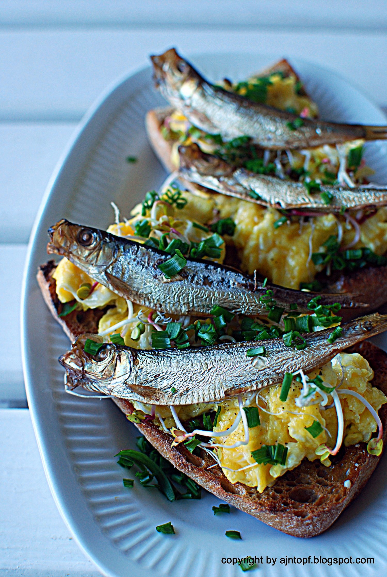 Z jajek zróbcie na patelni jajecznicę, doprawcie ją solą i pieprzem. Kromki chleba posmarujcie masłem, ułóżcie na nich jajecznicę, rozłóżcie następnie kiełki, połóżcie po 2 sardynki na pajdę, posypcie szczypiorkiem. Smacznego!
