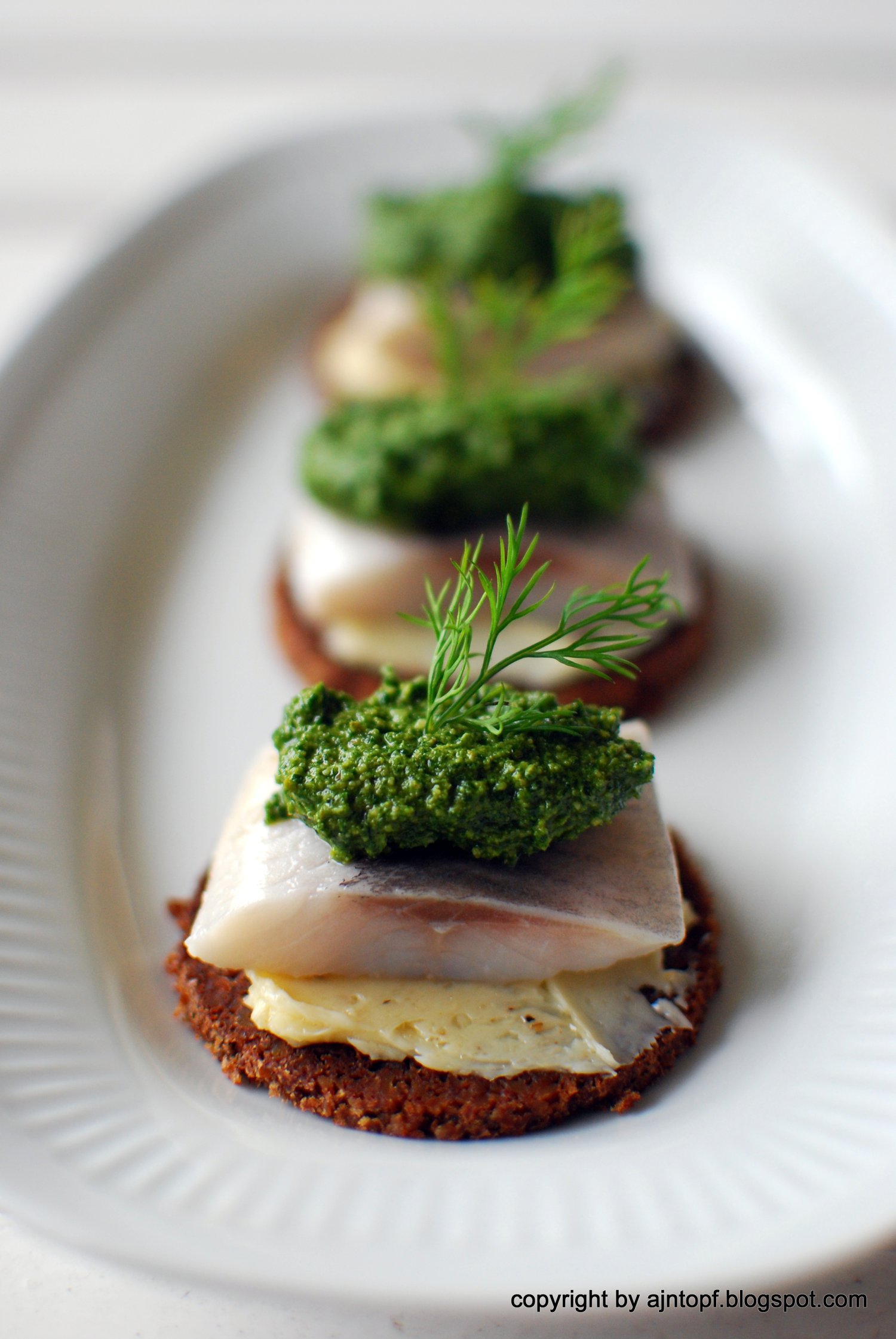 Śledzia wymoczcie porządnie w wodzie (2-3 h). Z pumpernikla wytnijcie kanapeczki. Masło utrzyjcie z sokiem z cytryny, dodajcie pieprz. Wszystkie składniki pesto zmiksujcie w malakserze, powoli dolewając oliwę, aż masa będzie gładka. Pumpernikiel posmarujcie masłem, połóżcie na niego kawałek śledzia posmarowanego pesto, udekorujcie świeżym koperkiem. Smacznego!