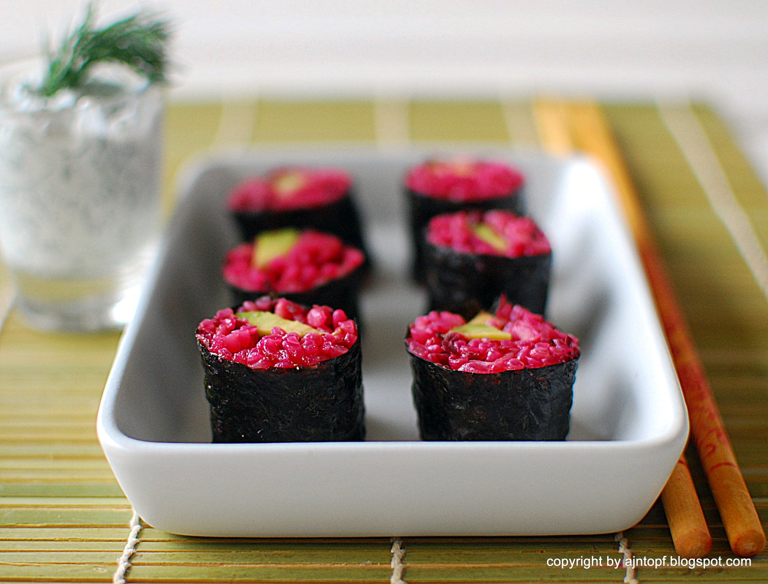 Obierzcie awokado i potnijcie na paski. Rozłóżcie matę bambusową, na niej liść nori, na którym, na całej powierzchni ułóżcie buraczany ryż. Na środku ułóżcie wzdłuż awokado. Wszystko zwińcie, dociskając matą. (w czeluściach internetu znajdziecie wiele wskazówek jak to zrobić sprawnie i skutecznie). Śmietanę wymieszajcie z drobno posiekanym koperkiem. Smacznego!