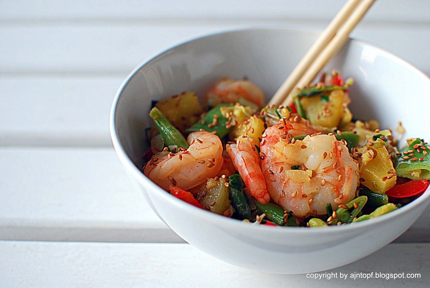 Na głębokiej patelni rozgrzejcie olej. Wrzućcie cebulę i paprykę, smażcie ok. 1-2 minuty. Dodajcie krewetki, smażcie aż zmienią kolor na różowy. Dodajcie ananasa, fasolę i szczypiorek. Smażcie ok. 1 minutę. Dodajcie imbir, sos sojowy, pieprz i sambal oelek (jeśli używacie). Wymieszajcie wszystko, niech smaki się przenikną. Na koniec wrzućcie na chwilę kiełki, wymieszajcie. Podawajcie posypane uprażonym sezamem. Smacznego!