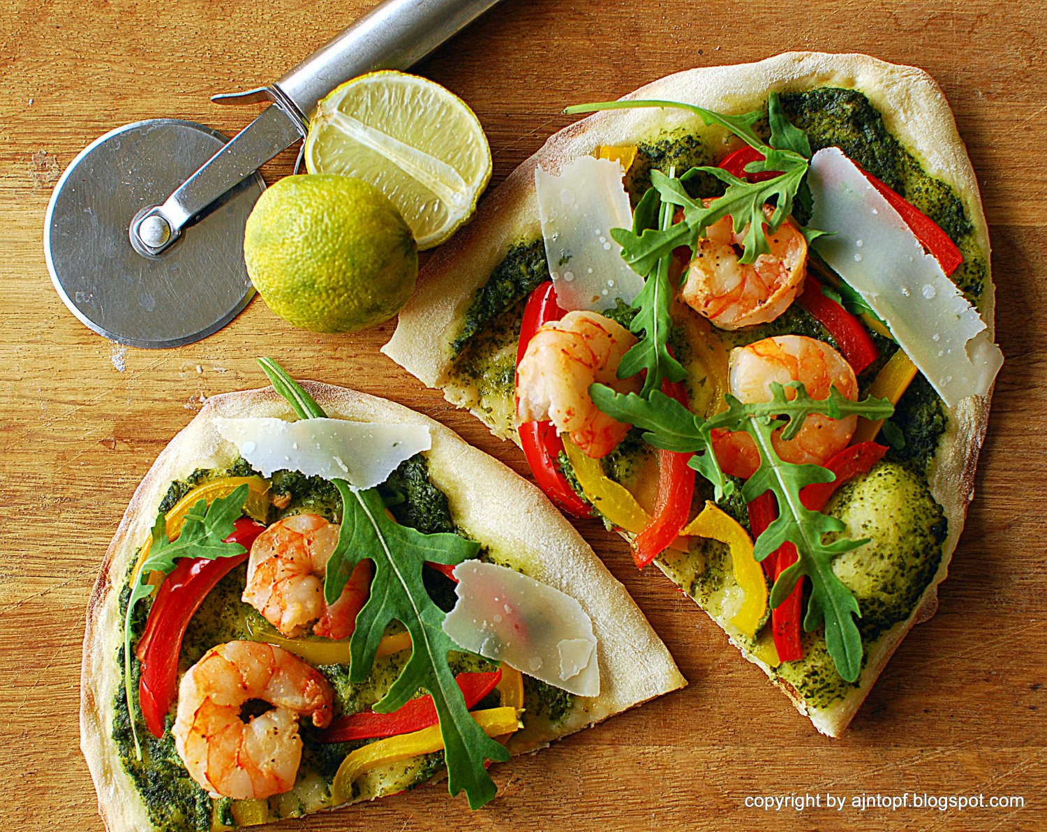 Drożdże i cukier wymieszajcie z wodą i odstawcie na 5 minut. Mąkę wsypcie do miski i dodajcie sól. Gdy drożdże zaczną pracować wlejcie je do miski z mąką. Ciasto wyrabiajcie początkowo w misce, gdy składniki się połączą, wyłóżcie je na kuchenny blat, bądź stolnicę oprószone mąką i dalej zagniatajcie, aż stanie się gładkie, sprężyste i miękkie. Oprószone mąką, przykryjcie folią do żywności i odstawcie na 15 minut, żeby nieco odpoczęło od tego ugniatania. Gdy już wypocznie, podzielcie na 2 części, jedną wrzućcie do zamrażalnika, będzie na później, drugi kawałek rozwałkujcie do wielkości zbliżonej do blachy. Gotowe ciasto przełóżcie na blachę wyłożoną papierem do pieczenia, posmarujcie gotowym pesto. Wyłóżcie paprykę, krewetki, wstawcie do pieca rozgrzanego do 250'C i pieczcie ok. 8-10 min. Po wyjęciu posypcie liśćmi kolendry bądź rukoli, skropcie sokiem z limonki, posypcie parmezanem. Smacznego!
