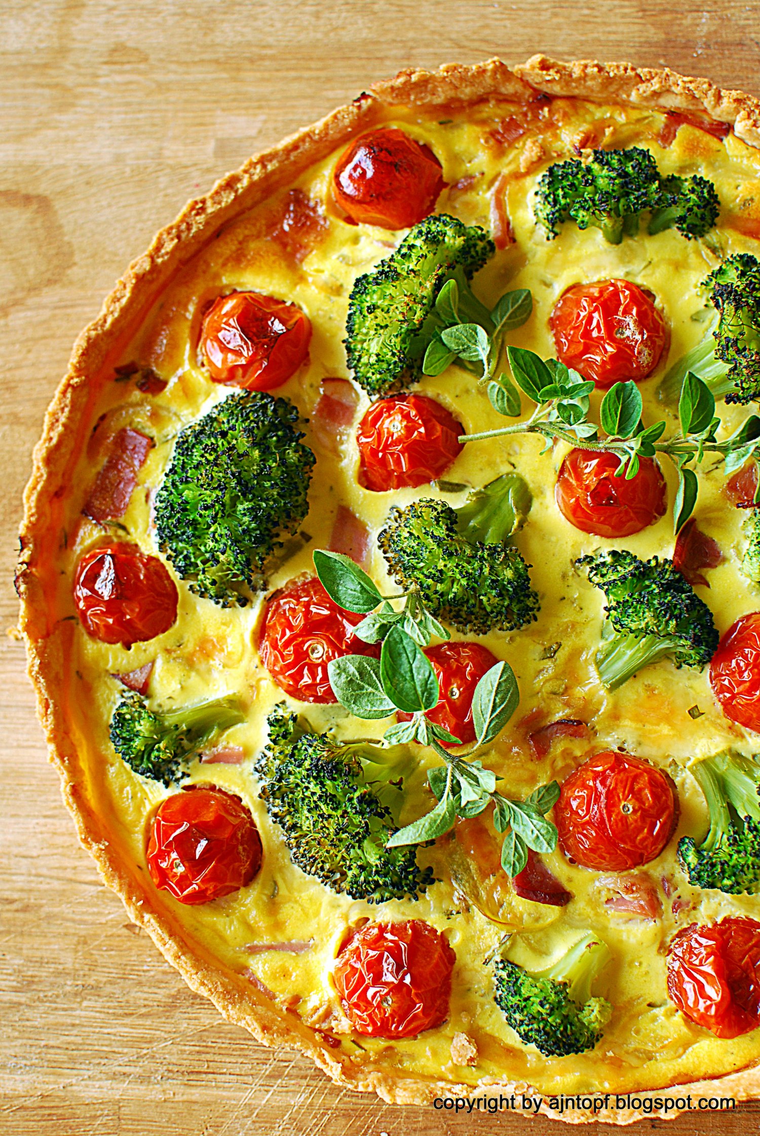 Na ostudzone ciasto wylejcie masę z jajek, rozprowadźcie łopatką. Ułóżcie brokuły, szynkę i pomidorki. Wstawcie do pieca rozgrzanego do 180'C na ok. 40 minut. Posypcie świeżym oregano. Smacznego!