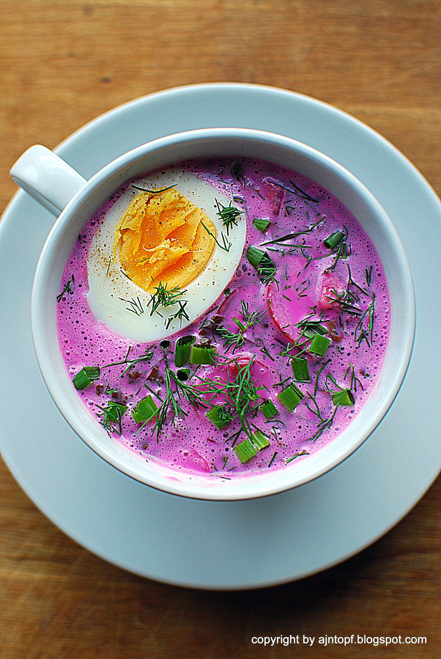 Botwinę umyjcie, posiekajcie. Jeśli miała buraczki, obierzcie je i również drobno posiekajcie. Wrzućcie wszystko do garnka, zalejcie wodą, posólcie, dodajcie cukier i gotujcie na średnim ogniu ok. 15 minut, do miękkości. Dodajcie sok z cytryny, wymieszajcie i odstawcie do wystygnięcia. W malakserze wymieszajcie ze sobą kefir, koperek, dodając sól i pieprz do smaku. Mieszankę kefirową dodajcie do ugotowanej botwiny, wymieszajcie, dodajcie ogórka, rzodkiewki, wstawcie do lodówki na 2-3 godziny. Wlejcie zupę do miski, dodajcie ugotowane jajko, posypcie koperkiem i szczypiorkiem. Smacznego!