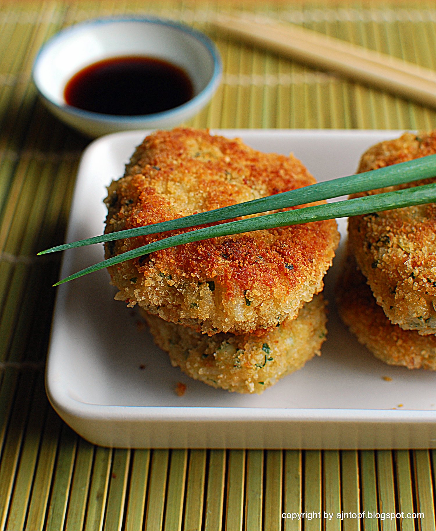 Wszystkie składniki oprócz ryżu i sosu sojowego, wrzućcie do malaksera, zmiksujcie. Dodajcie ugotowany ryż, wymieszajcie delikatnie łyżką bądź rękami. Na patelni rozgrzejcie na średnim ogniu olej. Z gotowej masy uformujcie pulpety, obtoczcie w bułce tartej i smażcie po ok. 5 minut z każdej strony. Podawajcie ciepłe z sosem sojowym, bądź teriyaki w osobnym naczyniu. Smacznego!