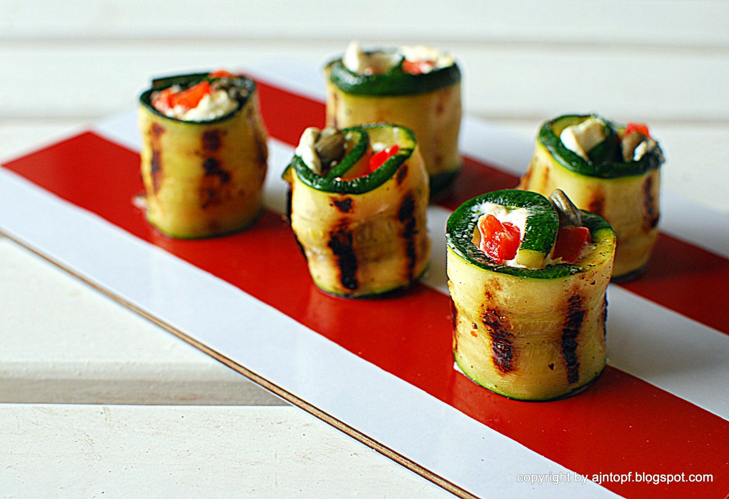 Rozgrzejcie piekarnik do 200'C. Paprykę umyjcie, wytnijcie gniazdo. Pieczcie przez 15-20 minut, aż zrobi się lekko czarna. Przełóżcie ją do worka foliowego, szczelnie zamknijcie i odczekajcie 10 minut, łatwiej ją teraz obierzecie. Pokrójcie w kosteczkę, odstawcie. Cukinię umyjcie, odetnijcie końce, pokrójcie w cienkie plastry. Cukinię posmarujcie z obu stron oliwą, popieprzcie i posólcie. Rozgrzejcie patelnię grillową, cukinię smażcie ok. 3 minuty z każdej strony. Odłóżcie na ręcznik papierowy, poczekacie aż wystygnie. Każdy pas cukinii posmarujcie serkiem, wyłóżcie paprykę, kapary, zwińcie. Smacznego!
