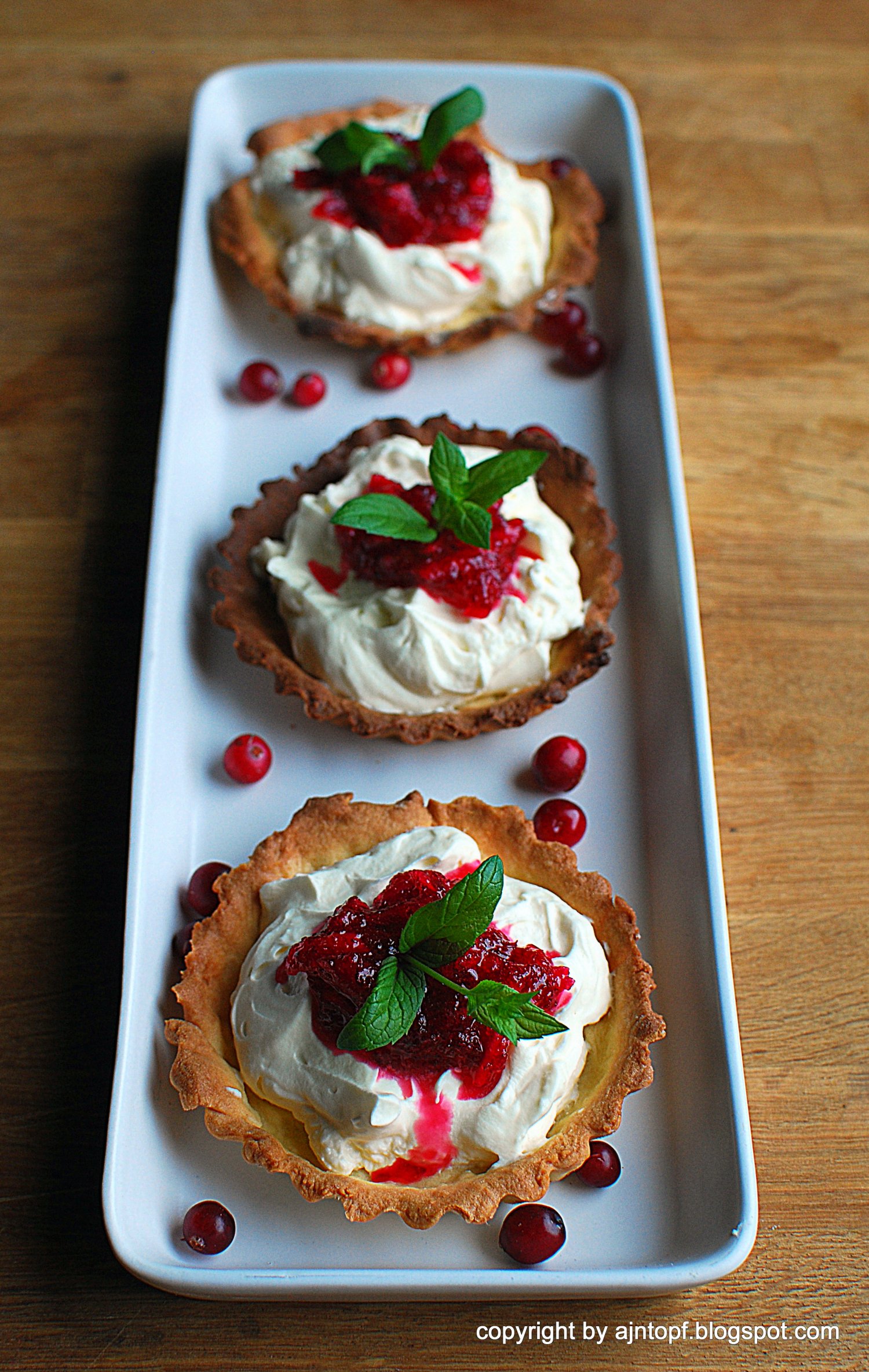 Składniki ciasta wrzućcie do malaksera, zagniećcie ciasto, podzielcie na 4 części, rozwałkujcie i wyłóżcie nimi foremki. Wstawcie do lodówki co najmniej na 1 godzinę. Rozgrzejcie piekarnik do 180'C, wyjmijcie foremki z lodówki, nakłujcie widelcem ciasto, wsypcie trochę fasoli do obciążenia, żeby ciasto się nie przesuwało rosnąc. Pieczcie 15 minut. Wyjmijcie, wysypcie fasolę i znów wstawcie do pieczenia na ok. 15 minut, aż się ciasto zrumieni. Przygotujcie krem, zmiksujcie ze sobą mascarpone, śmietanę i powoli wsypując cukier. Na ciastka wyłóżcie krem a następnie 1 łyżkę konfitury z żurawin, bądź inne owoce, maliny czy borówki. Smacznego!