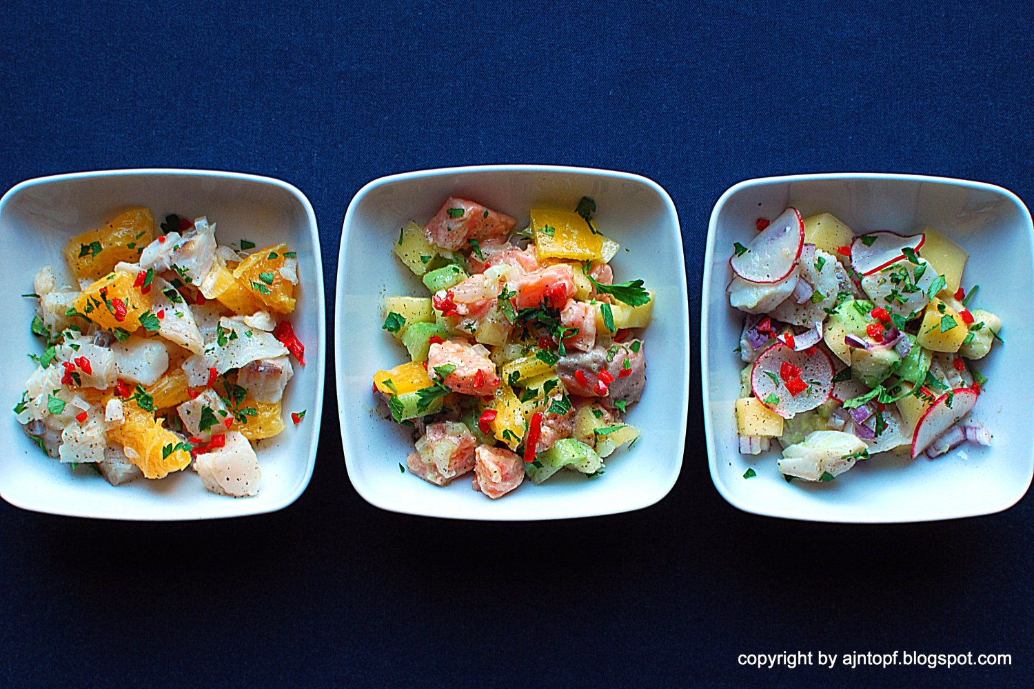 Ceviche to sałatka/przekąska z surowej ryby lub owoców morza, z dodatkiem różnorodnych warzyw. Ryba marynowana jest w soku z cytrusów, to one ścinają białko, zabijają niepożądane mikroorganizmy i sprawiają, że ryba staje się biała i gotowa do jedzenia. Ceviche, podobnie jak Miś Paddington pochodzi z mrocznych zakątków Peru :) Meksyk i Ekwador również chwalą się nim, jako swoją narodową potrawą.